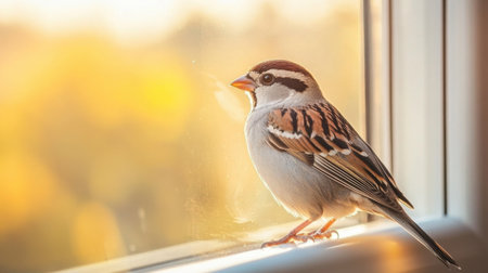 A sparrow bird sitting on a house window, with sunlight illuminating the scene, bringing a sense of calm and simplicity.