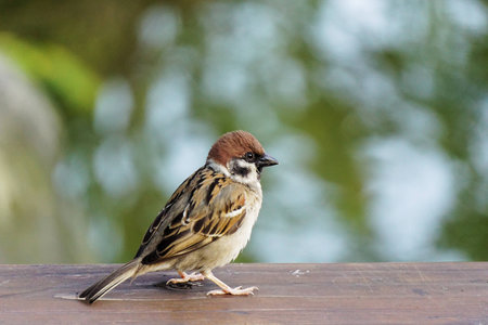 Eurasian Tree Sparrow bird sitting on table wood