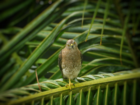 Close-up of a sparrowhawk sitting on a palm leaf