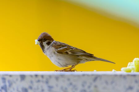 Close up of sparrow bird eating bread