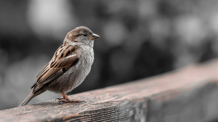 Male house sparrow standing on wooden table in New Zealand