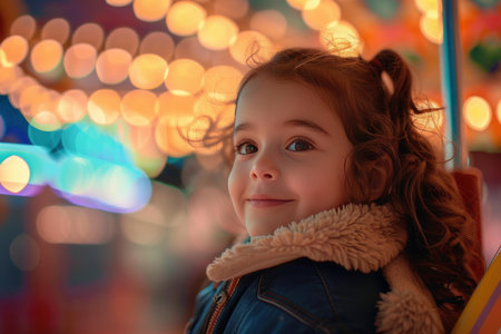 Portrait of a joyful little girl with glowing bokeh lights at a fairground at dusk