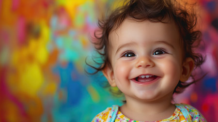 Joyful baby laughing against a vibrant, colorful bokeh background, capturing a playful and cheerful mood with bright lighting.