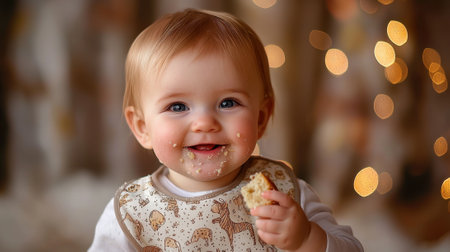 A joyful baby with a big smile has crumbs on their face while holding a snack, surrounded by warm, twinkling lights that create a festive mood.