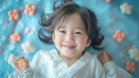 Cute asian little girl lying on the bed and smiling.
