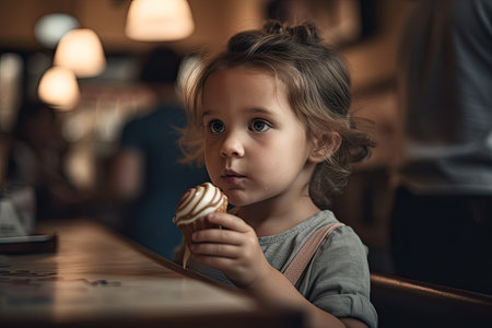 a little girl eating an ice cream cone at a table with other people in the background and one child is looking into the camera