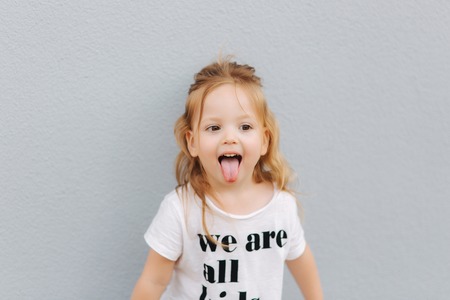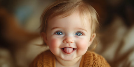 An 18-month-old baby girl with blue eyes and light brown hair is smiling and sticking out her tongue, displaying an adorable expression. She is dressed in a cozy sweater and looks full of joy.