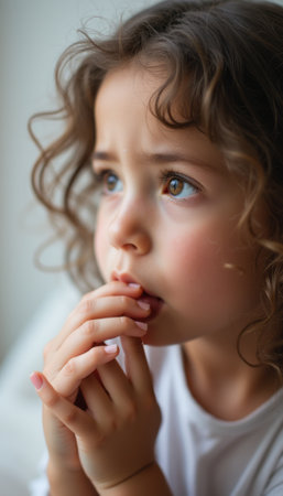 A young girl with curly hair gazes pensively out the window, her expression reflecting deep contemplation. Her delicate features and expressive eyes convey a sense of wonder and curiosity about the world beyond.