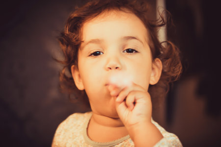 This charming image features a sweet baby girl with curly hair styled in playful pigtails, wearing a polka dot shirt and denim jeans. Her wide, curious eyes and gentle expression radiate innocence and joy, capturing the essence of childhood wonder.