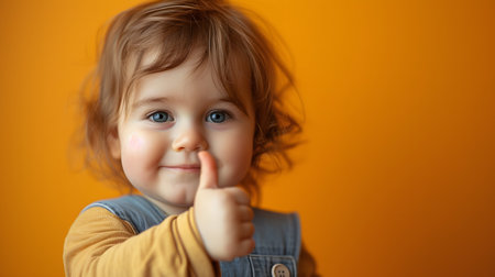 Little girl shows thumbs up on a yellow background. Close-up.