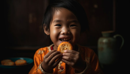 Smiling girl holding fruit, enjoying nature beauty generated by artificial intelligence