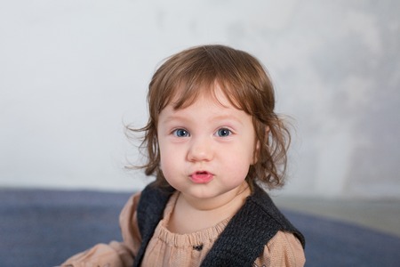 Portrait of a cute little girl with blue eyes in the bedroom
