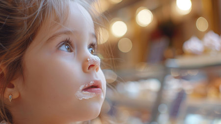 The little girls face is covered in frosting, with a smile on her mouth and a hint of frosting on her nose. Her eyes sparkle with joy as she looks ahead AIG50