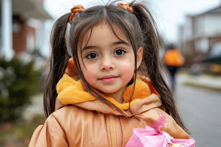 A tiny trick-or-treater, her costume adorable and candy bag full, navigates a foggy Halloween night Spooky figures lurk in the shadows, their eerie costumes adding to the chilling atmosphere Kids in whimsical costumes, their laughter echoing in the air, make their rounds, eager to collect their sweet rewards AI Generative