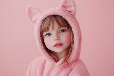 Studio portrait of charming girl wearing pink furry kitten costume, embodying sweetness and fun against a vibrant pink backdrop