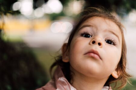 Toddler girl close up portrait. Surprised child outdoors in park. Camping concept.