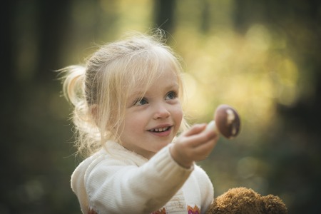 Little girl harvest mushrooms in woods. Child with fresh mushroom in autumn forest. Organic and healthy food. Upbringing and early development. Childhood activity and active rest outdoor.