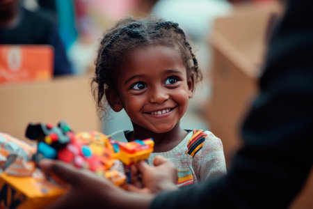 A young girl beams with happiness as she receives a vibrant toy from a caring adult at a community gathering. The atmosphere is filled with laughter and camaraderie, exuding warmth and joy.