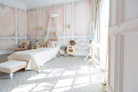 Luxurious expensive interior design of the bed room in the old Baroque style in beige colors