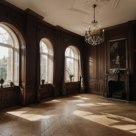 An interior shot reveals an opulent room featuring antique chairs, a round table, and a grand fireplace. The scene is illuminated by natural light streaming through large windows, highlighting the ornate details and textured walls. This image could be used for various commercial projects related to design or luxury lifestyle.