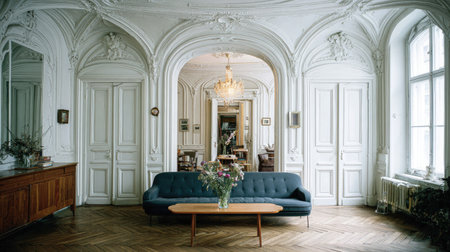 An interior scene features a spacious living room dominated by white architectural details. A blue sofa and wooden table are set on a parquet floor. Bright, natural light streams in through large windows. This image could be suitable for interior design publications or real estate promotion.