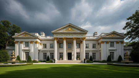 A stately mansion with classical architectural elements stands prominently. The building features white facades, symmetrical design, and detailed columns. Lush green lawns and decorative fountains adorn the foreground. The sky above is filled with dramatic cloud formations, suggesting a potential weather change. This image is suitable for various commercial uses, including real estate promotions and architectural illustrations.