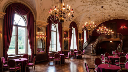 captures a section of an ballroom within a historic building, featuring a prominent grand staircase. Round tables with red velvet cloths and matching chairs are arranged, creating intimate seating areas. Large arched windows are draped with red velvet curtains, and ornate chandeliers illuminate the space. Mirrors on the walls reflect the light and the detailed architecture, including the decorative ceiling and gilded trim, contributing to a and opulent atmosphere.