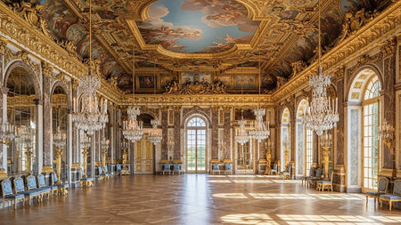A ballroom with an elaborately decorated ceiling featuring painted frescoes and gilded ornamentation. Large crystal chandeliers hang from the ceiling, casting a warm glow. The walls are adorned with marble and intricate gold detailing. Sunlight streams through tall arched windows, illuminating the polished wooden parquet floor. Blue upholstered chairs are arranged along the walls, hinting at a formal setting.