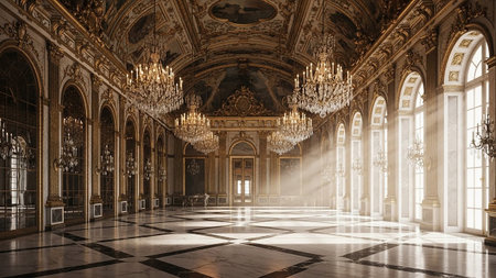 A and grand ballroom bathed in dramatic shafts of sunlight. The expansive marble floor, laid in a striking geometric pattern, reflects the light and the opulent details of the interior. Ornate gold decorations adorn the walls and arches, leading the eye towards a highly decorated ceiling featuring classical frescoes. Numerous crystal chandeliers hang, awaiting illumination. The empty space, filled with atmospheric light rays, evokes a sense of historical grandeur, serenity, and the potential...
