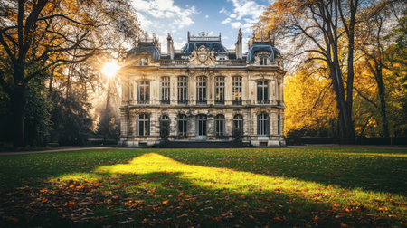 A stunning historical mansion stands majestically amid vibrant autumn trees, basking in sunlight, creating a tranquil scene perfect for nature lovers and photography enthusiasts.