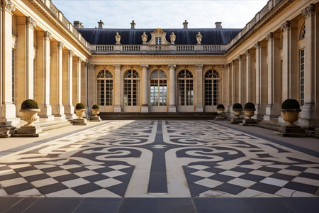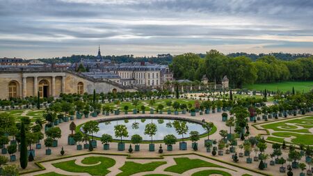 Symmetric french gardens of the Orangerie of Versailles palace in France. Generative Ai
