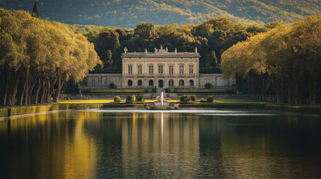 The charming historic mansion features intricate architecture and beautiful landscaping, peacefully mirrored in the calm waters of the nearby lake during the golden hour.