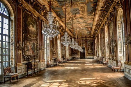 Ornate hallway of a palace featuring multiple chandeliers, elegant molding, arched windows, and reflective marble flooring with a classical luxurious atmosphere.