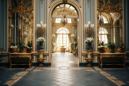 An Antique Ballroom with Crystal Chandeliers and Ornate decor. Generative AI.