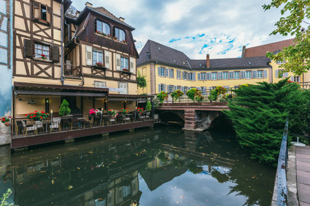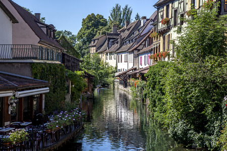 France, Colmar - July 26, 2017. Old-time residential buildings along the canal in the French city of Colmar in the province of Alsace. Medieval buildings in perfect condition