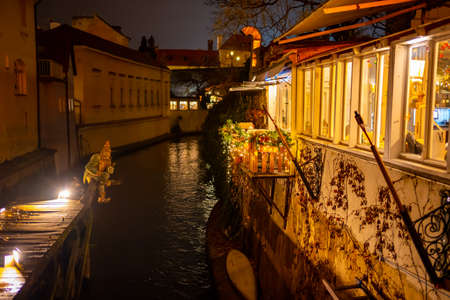 Colorful night Old Mills on Prague Stream Certovka, Czech Republic