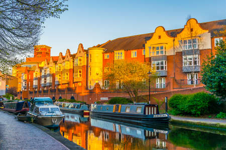 Sunset view of brick buildings alongside a water channel in the central Birmingham, England