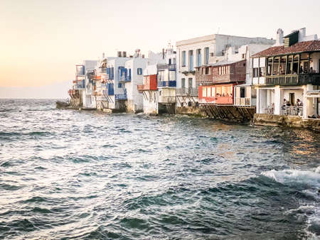 Mykonos Town, Greece - September 24, 2019: View of restaurants in Little Venice, Hora (Mykonos Town), the islands well-preserved port and capital, from the beach.
