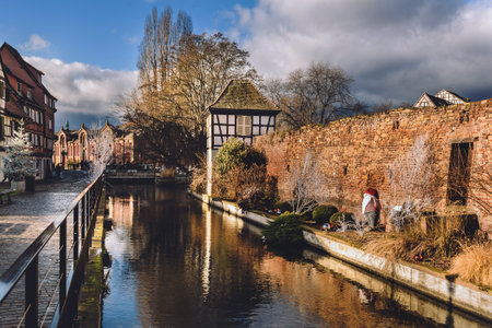 Colmar, France - December 6, 2023: Traditional Alsatian half-timbered houses in Petite Venise or little Venice district, Colmar, decorated at Christmas time, Alsace, France