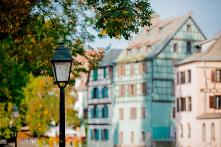Vintage street lamp with near a tree in fall season. Strasburg, France