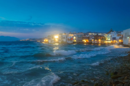 Little Venice waterfront at Mykonos illuminated island at night, Greece
