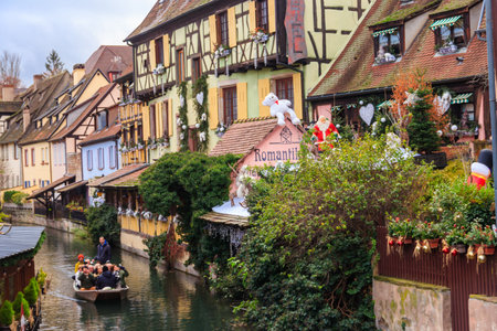 The streets of Colmar in Alsace, France include a navigable canal through the city center