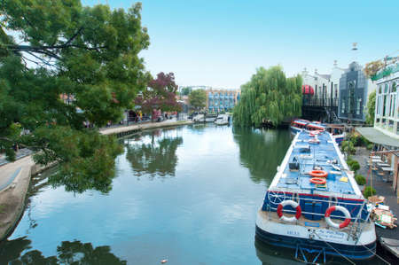 London, U.K, Aug 2019, view of a barge navigating on the Regent`s Canal in Camden Town