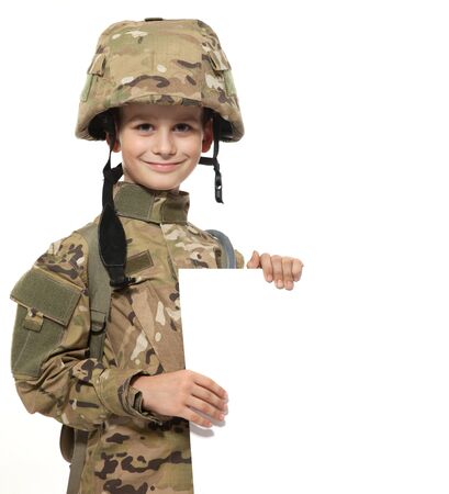 Young Boy Dressed Like a Soldier holding banner isolated on white