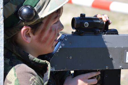 Young Boy playing laser tag while dressed in army style overalls