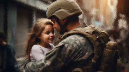Soldier hugging sad little daughter while leaving for war. A man rescues and calms a frightened child during the fighting