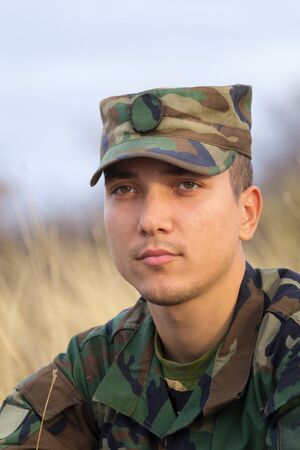 Portrait of attractive male soldier wearing camouflage uniform looking at camera
