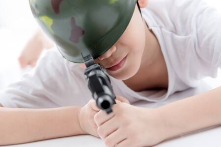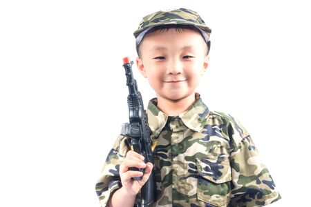 Asian boy with gun isolated on white background, childhood dream's concept