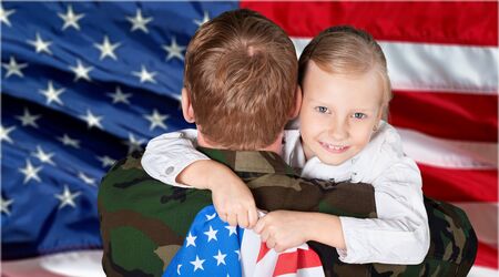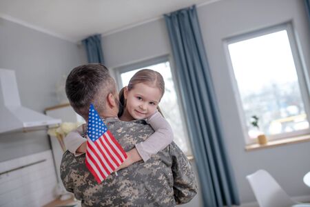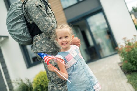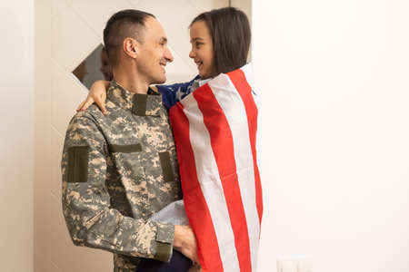 Candid close up of girl embracing military dad and holding american flag, copy space