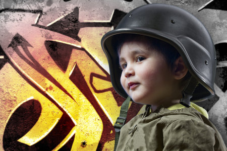 Baby playing war with military helmet against graffiti background with intense orange light